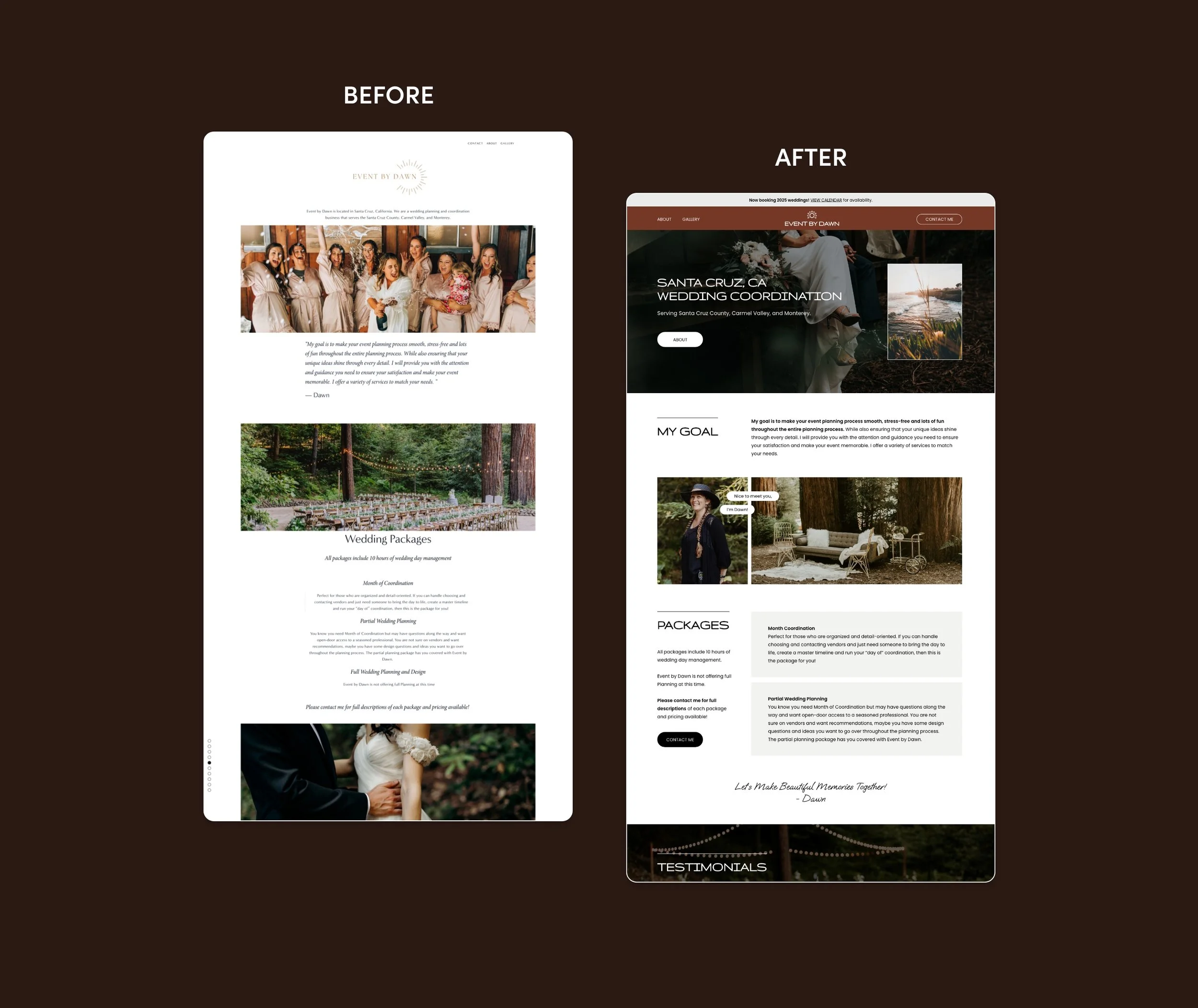 In rebranding, our goal was to capture the essence of the weddings that Event by Dawn typically works on. We chose a color scheme that is both moody and welcoming. The main issue with the old branding and website was the inability to convey the unique personality and impression that Event by Dawn creates for clients.